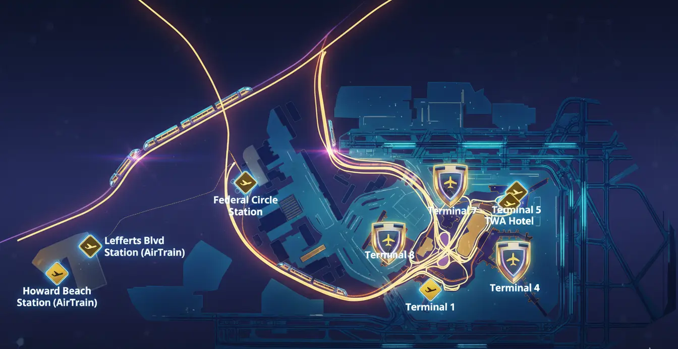 A map of John F. Kennedy Airport helps you understand how Terminal 1 fits into the full JFK layout. The AirTrain stops directly outside the terminal. This makes transfers easier.
